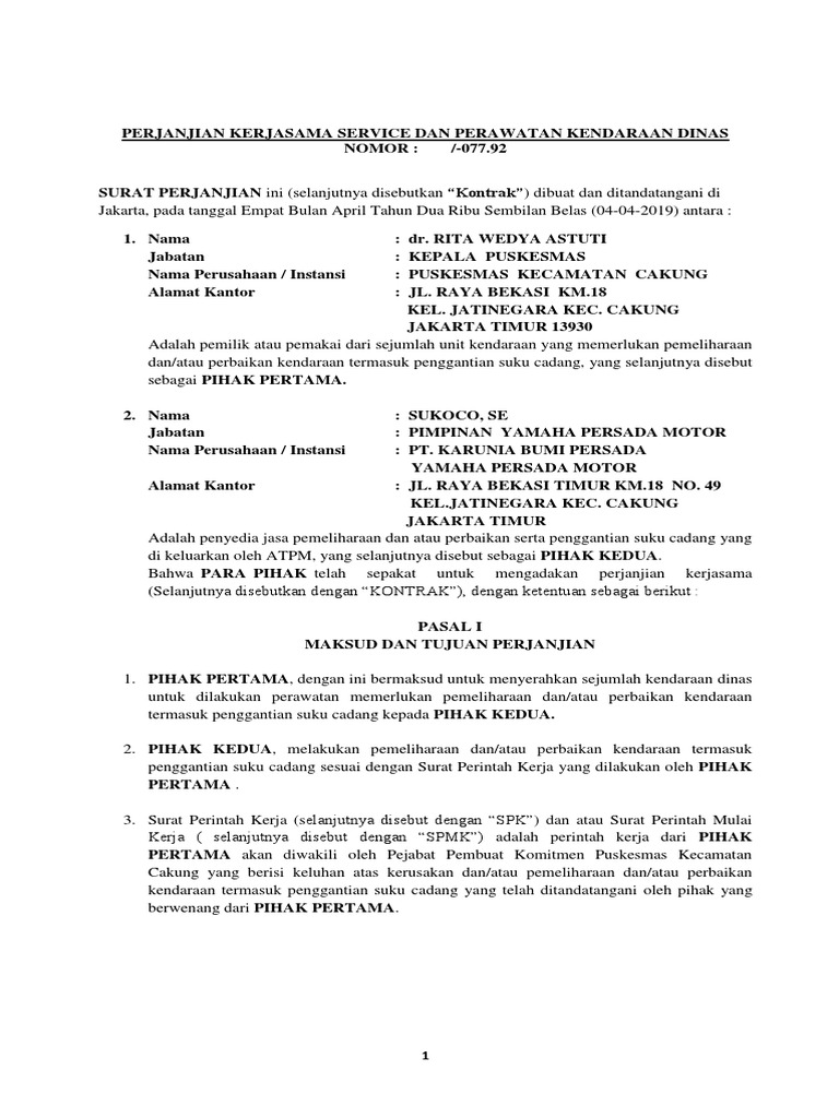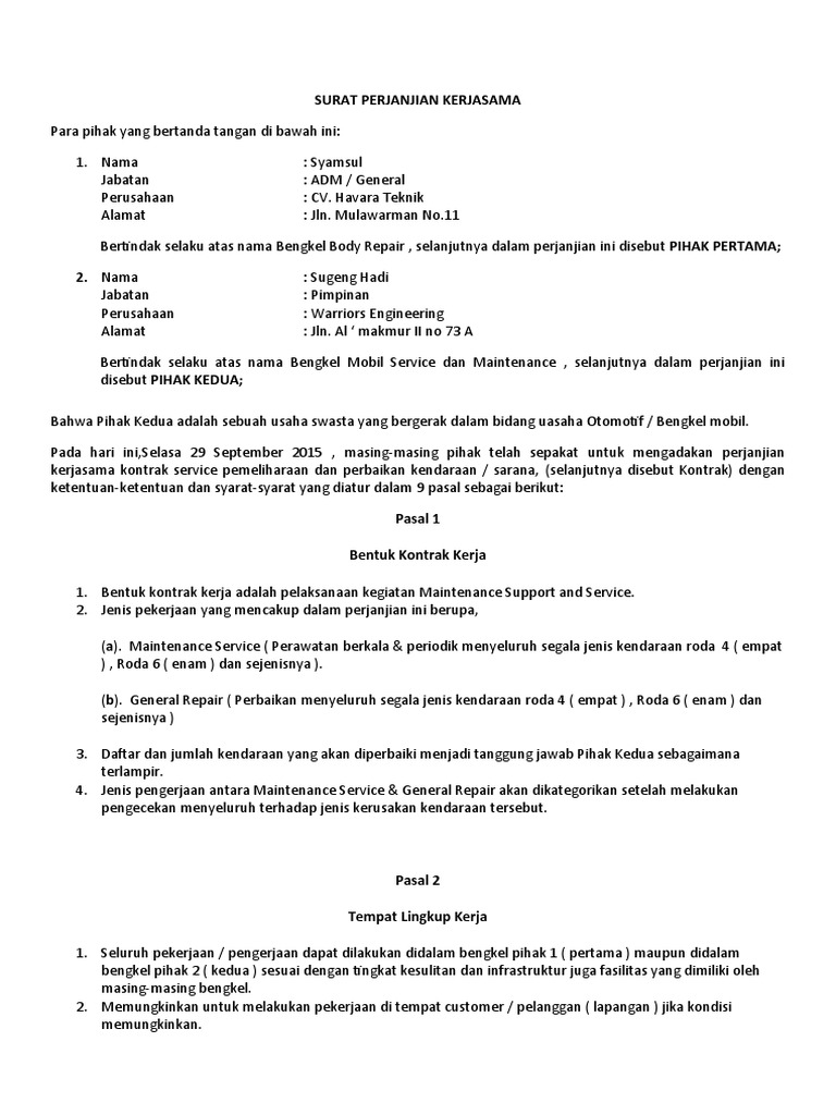 Kami berharap semoga ulasan contoh surat perjanjian kerjasama service kendaraan dapat memberikan gambaran secara utuh kepada Anda mengenai contoh surat perjanjian kerjasama service kendaraan serta aneka peluang bisnis dan investasi lainnya saat ini. Oleh sebab itu setiap perusahaan pasti akan mencari dan bekerja sama dengan supplier terbaik. Up to 3 cash back Bahwa PARA PIHAK telah sepakat untuk mengadakan perjanjian kerjasama Selanjutnya disebutkan dengan KONTRAK dengan ketentuan sebagai berikut.